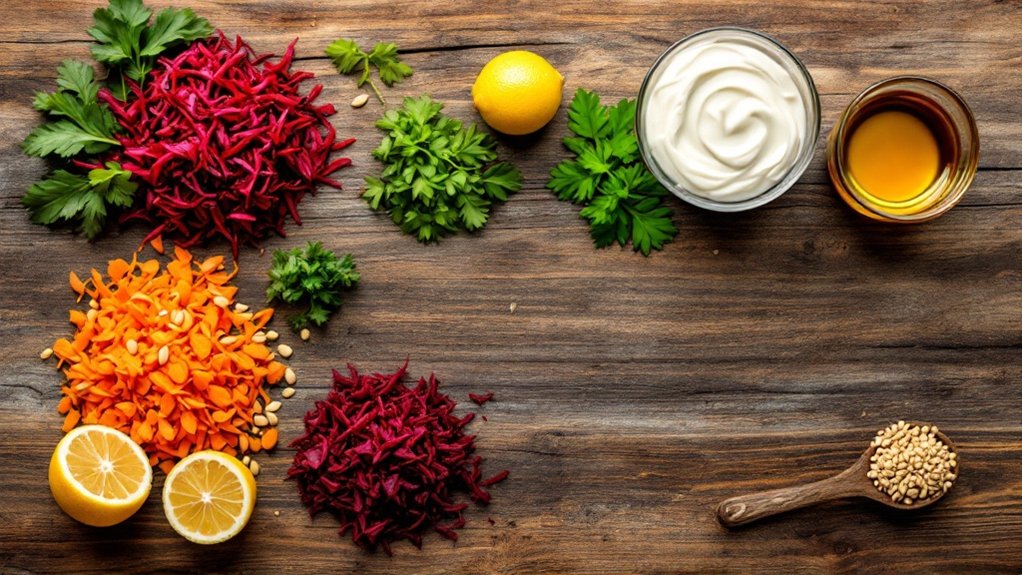 - Salotose derinami tarkuoti žali burokėliai ir morkos su petražolėmis, skrudintomis saulėgrąžų sėklomis ir aštriu citrinų ir medaus padažu.